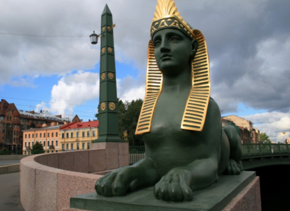 В 1826 году через Фонтанку по оси Лермонтовского проспекта был построен оригинальный цепной мост, оформленный в «египетском стиле». На въездах на мост установили по два сфинкса, отлитых из чугуна на заводе Берда по модели скульптора П. П. Соколова, уже известного своими львами на Львином мосту и грифонами на Банковском. Сфинксы имели женские лица, напоминавшие, по мнению многих, лик Елизаветы Алексеевны, супруги Александра I.