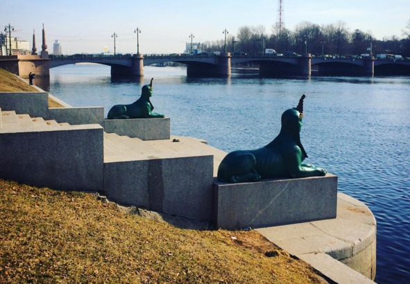 Эти странные сфинксы с заячьими ушами были установлены на Фонтанке у входа в клуб «Пурга» в 2004 году. Их история автору не известна.