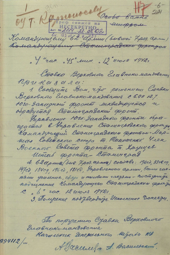 «Ставка Верховного Главнокомандования приказывает: с 6 часов 10 августа подчинить Сталинградский фронт командующему Юго-Восточному фронту генерал-полковнику Ерёменко, оставив за товарищем Ерёменко командование Юго-Восточным фронтом по совместительству.