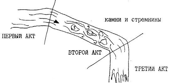 Первый акт. Диаграмма изображает реку, несущуюся в горном ущелье. В первом акте вы пускаете своего героя в плавание в утлом челноке. Течение стремительно. У героя нет пути назад. Река делает крутой поворот. Не видно, что вас ждет впереди.