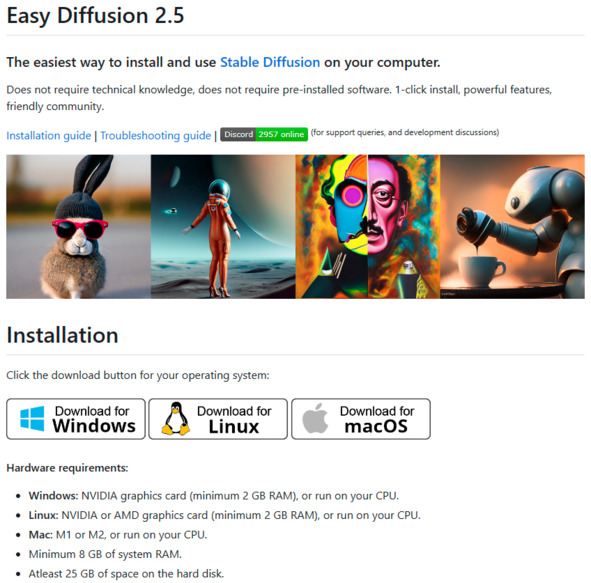 Для того чтобы нам установить программу Easy Diffusion, переходим по следующей ссылке и скачиваем нужный дистрибутив для установленной у нас операционной системы (MS Windows, Linux или MacOS):