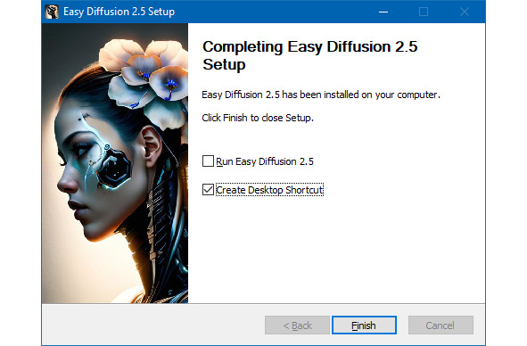 Обязательно поставьте галочку напротив «Create Desktop Shortcut» («Создать ярлык на рабочем столе») и уберите галочку с «Run Easy Diffusion 2.5» («Запустить Easy Diffusion 2.5»).