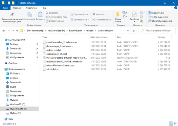 Все скачанные файлы моделей вам необходимо перенести («вырезать» и «вставить») в папку по следующему пути: «С:\EasyDiffusion\models\stable-diffusion» или «D:\EasyDiffusion\models\stable-diffusion».