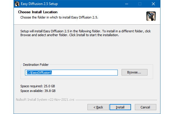 – Минимальное количество дискового пространства (либо диска «C:\», либо любого другого диска) 40 Гигабайт (25 для Easy Diffusion и 15 для моделей). Рекомендую устанавливать программу на флеш-диск компьютера (не внешний). С ним создание изображений будет происходить быстрее.