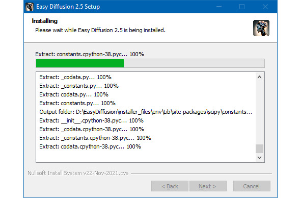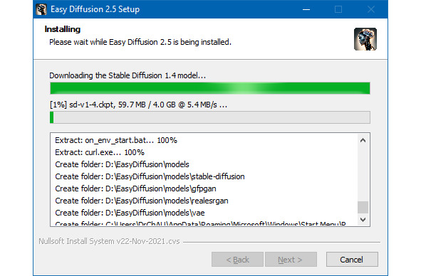 Программа во время этого процесса установит все необходимые ей файлы для первого запуска, в том числе установит различные модели, включая модель Stable Diffusion версии 1.4, с помощью которой вы будете создавать свои первые произведения компьютерного искусства: