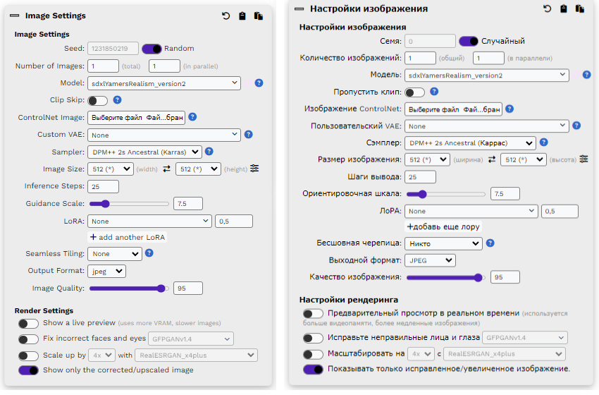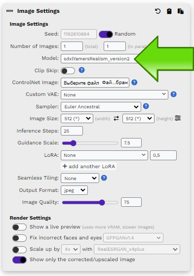 В разделе «Image Settings» («Настройки изображения») выберем алгоритм «sdxlYamersRealism_version2».