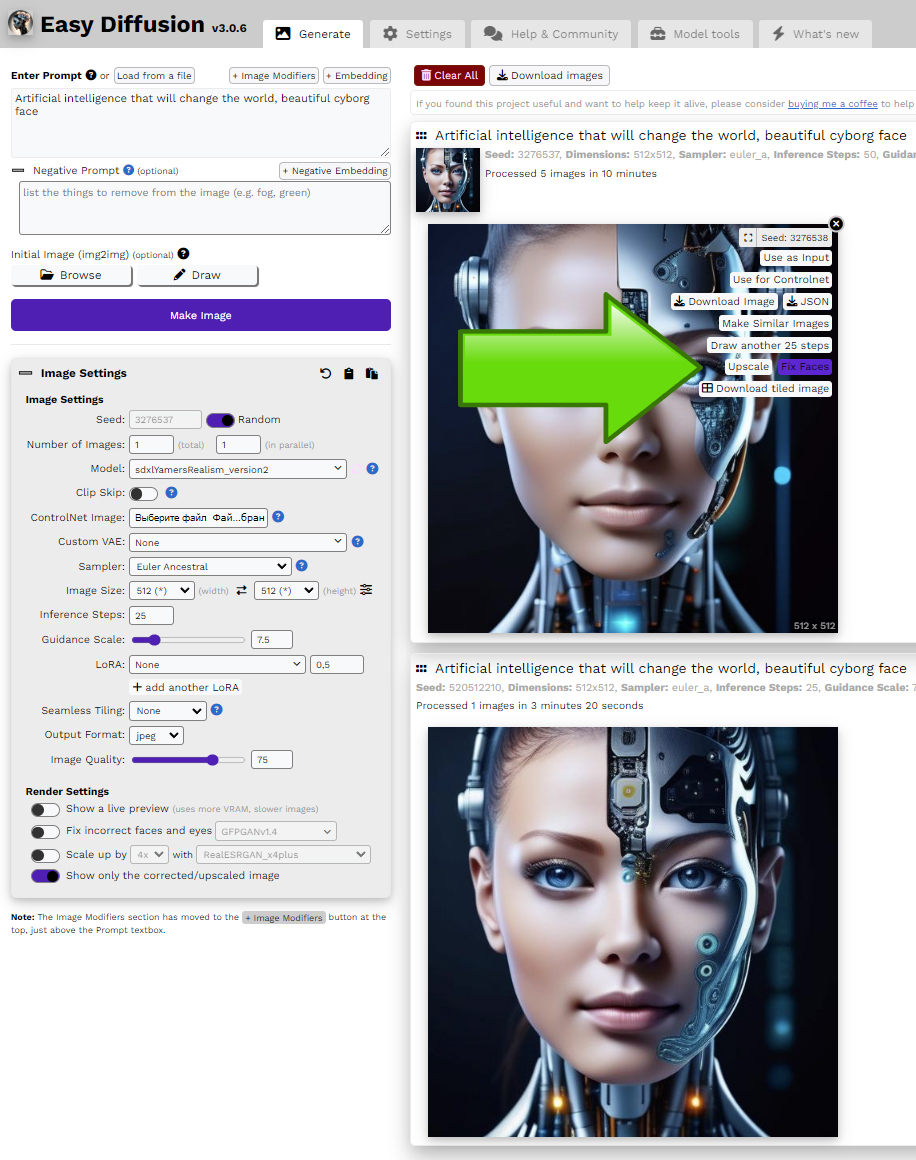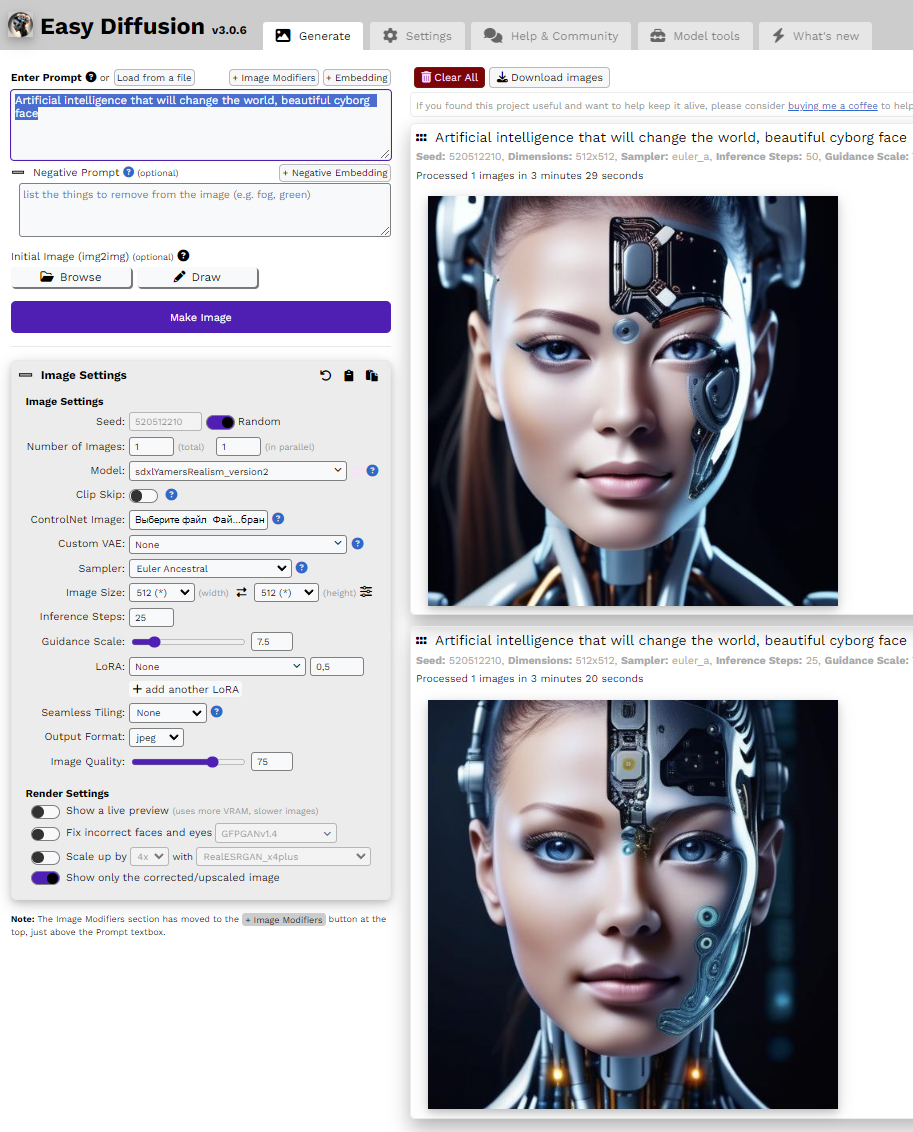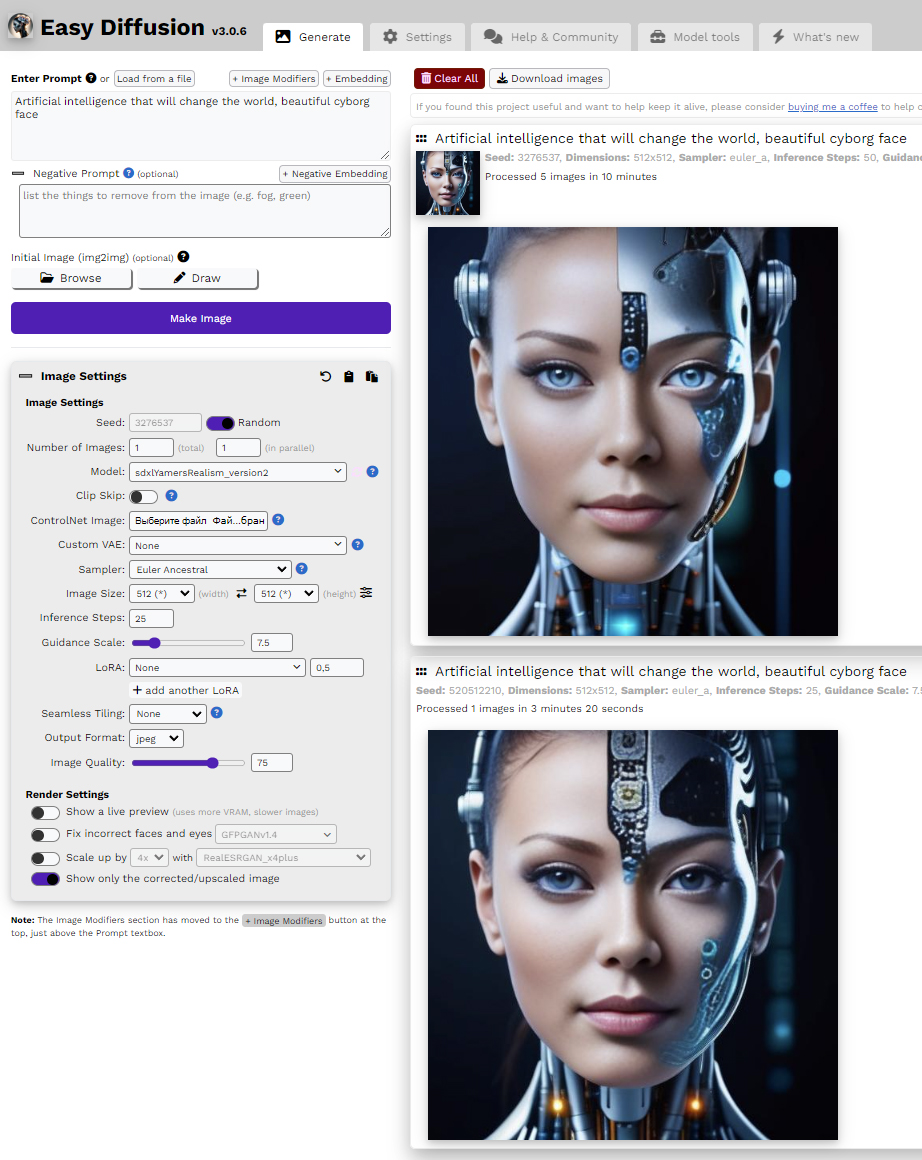 В окне «Enter Prompt» / «Ввести запрос» напишем следующий запрос на английском языке: «Artificial intelligence that will change the world, beautiful cyborg face» («Искусственный интеллект, который изменит мир, красивое лицо киборга»). Обратите внимание, что система Easy Diffusion понимает запросы только на английском языке. Если вы не очень сильны в нем, воспользуйтесь, пожалуйста, любым доступным вам онлайн-переводчиком.