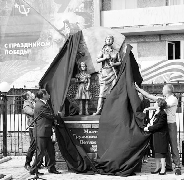 Вся команда, причастная к созданию памятника, творчески подошла к задаче. Вариантов было много, в итоге выбрали фигуру матери, которая проводила на фронт своих близких, она же – труженица села, которая воплощает собой подвиг всех тружеников тыла, всеми силами помогавших ковать Победу. Фигура маленькой девочки – это олицетворение всех детей, которые родились и выросли в годы войны. В руках у девочки маленький конвертик – это письмо с фронта. В этой композиции соединилось все: матери, дети войны, труженики тыла. Команда, которая работала над созданием памятника, вложила в него сердца и души!