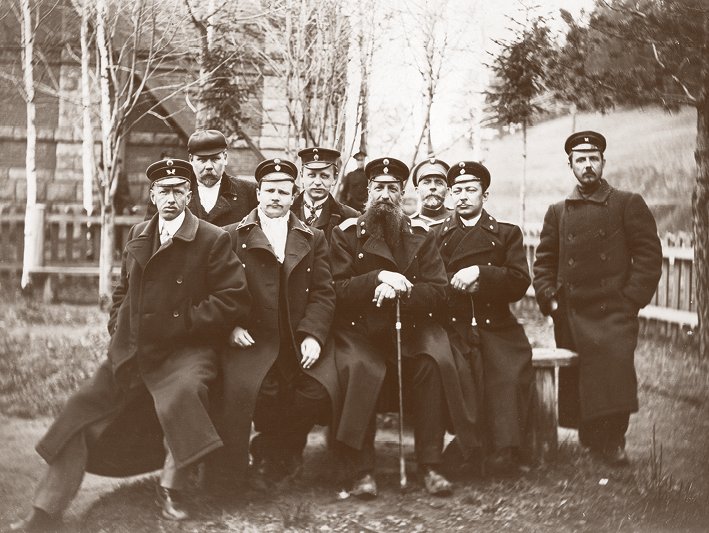 Василий Алексеевич Курчатов (стоит справа) с группой сослуживцев.