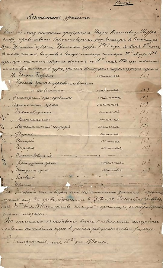 АТТЕСТАТ ЗРЕЛОСТИ СИМФЕРОПОЛЬСКОЙ ГИМНАЗИИ, ВЫДАННЫЙ И.В. КУРЧАТОВУ 18 мая 1920 г.