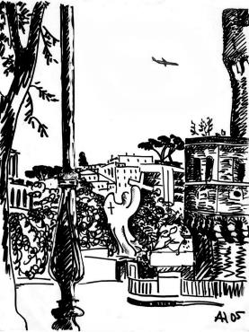 Две точки на карте расстоянием в 163 года…под сенью платана я сидел, спасаясь от жары и рисовал то, что видел перед собою: замок Сант-Анджело, ангел с крестом, Яникульский холм в районе Трастевере на западном берегу Тибра. А на этом холме Николай Васильевич Гоголь стоял перед церковью Сан-Пьетро-ин-Монторио и описывал на последней странице повести «Рим»5 то, что он видел: «Группами и поодиночке один из-за другого выходили домы, крыши, статуи, воздушные террасы и галереи; там пестрела и разыгрывалась масса тонкими верхушками колоколен и куполов с узорною капризностью фонарей; там выходил целиком темный дворец; там плоский купол Пантеона; там убранная верхушка Антониновской колонны с капителью и статуей апостола Павла; ещё правее возносили верхи капитолийские здания с конями, статуями; ещё правее над блещущей толпой домов и крыш величественно и строго подымалась темная ширина Колизейской громады; там опять играющая толпа стен, террас и куполов, покрытая ослепительным блеском солнца. И над всей сверкающей сей массой темнели вдали своей чёрною зеленью верхушки каменных дубов из вилл Людовизи, Медичис, и целым стадом стояли над ними в воздухе куполообразные верхушки римских пинн, поднятые тонкими стволами. И потом во всю длину всей картины возносились и голубели прозрачные горы, легкие как воздух, объятые каким-то фосфорическим светом. Ни словом, ни кистью нельзя было передать чудного согласия и сочетанья всех планов этой картины. Воздух был до того чист и прозрачен, что малейшая черточка отдаленных зданий была ясна, и всё казалось так близко, как будто можно было схватить рукою. Последний мелкий архитектурный орнамент, узорное убранство карниза – всё вызначалось в непостижимой чистоте» … Ну вот вам и «машина времени».