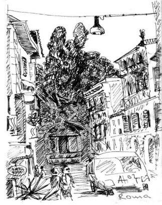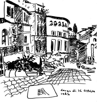 Кто-то уцелел и вернулся на улицу под названием Via di Sаnta Maria del Pianto, хотя, когда я её рисовал, на табличке было написано: Largo di 16 Ottobre 1943 – дата ликвидации гетто. Ларго по-русски значит небольшая площадь, делящая улицу на два отрезка. Немудрено, что бойкие агенты Google Maps просто не обратили внимания на эту тонкость местной топонимики.