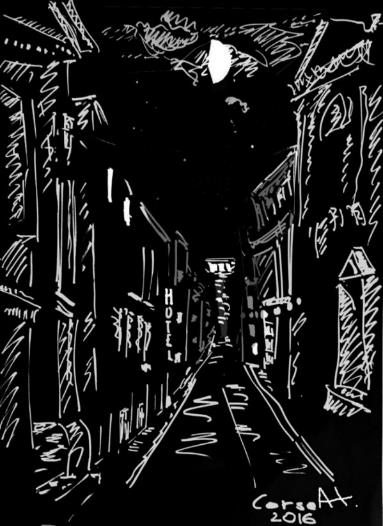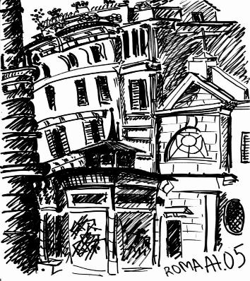 С его крыши в третьем акте спрыгнула бедная Флория Тоска, потеряв своего возлюбленного Марио Каварадосси. “Tutta Roma” – называется этот рисунок, эхом повторяя её слова, произнесенные над телом убитого ею в самом конце второго акта подлого барона Скáрпии: «E avanti a lui tremava tutta Roma! (А перед ним дрожал весь Рим!)».