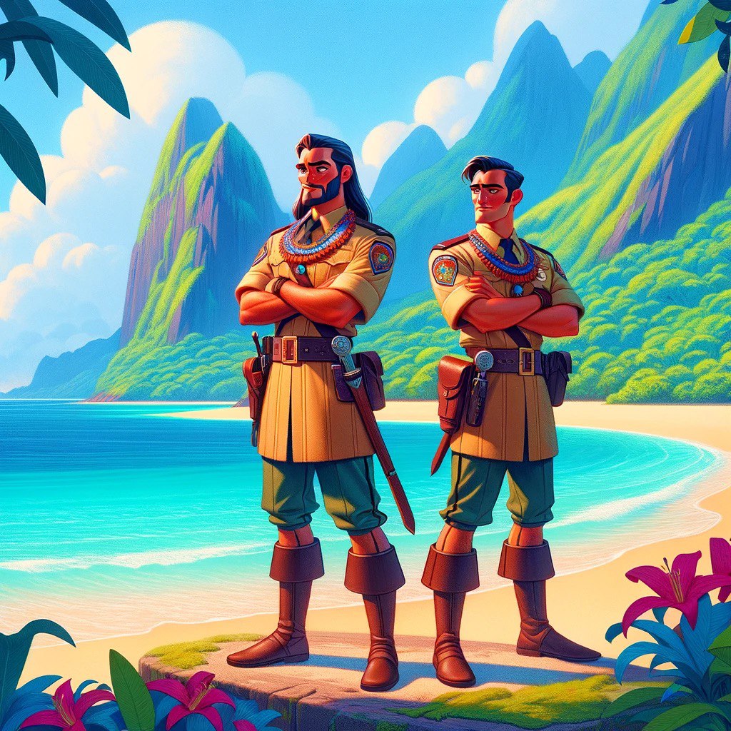 Пройдя небольшое расстояние от поезда, Эшли и Боб столкнулись с двумя стражниками. Эти непоколебимые хранители порядка неотступно следили за каждым, кто осмеливался приблизиться к Острову Развлечений. Их пронзительные взгляды, словно лучи радара, сканировали прибывших, пытаясь прочесть их намерения.