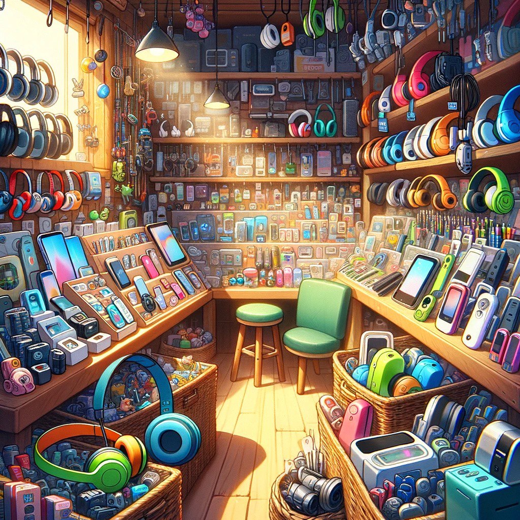 Затем они попали в крошечный, но удивительно разнообразный магазин гаджетов. Яркие наушники и компактный гаджет для измерения шагов стали практичными и в то же время забавными приобретениями, добавив в их приключение нотку современных технологий.
