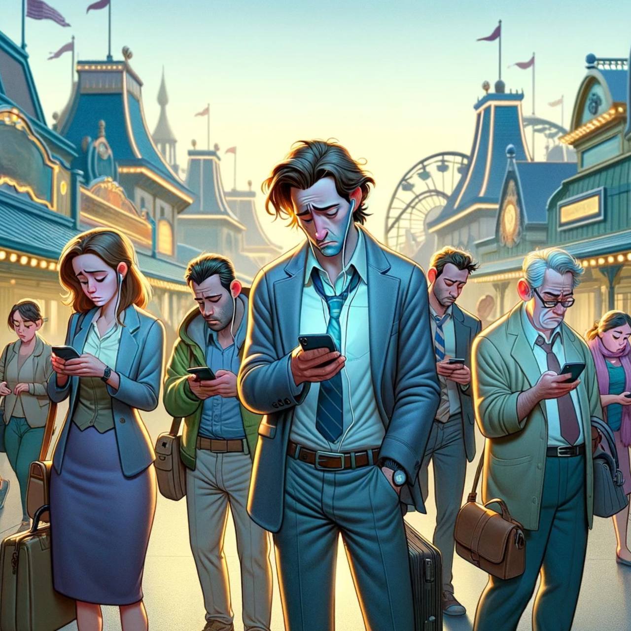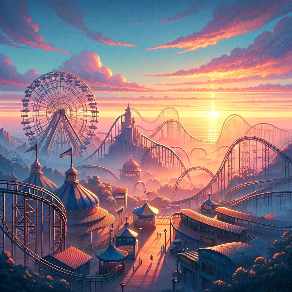 В лучах только что восходящего солнца, которое мягко освещало небо пастельными оттенками розового и золотого, Эшли и Боб отправились в путешествие к далекому краю Парка Развлечений. Они следовали за бледными отголосками фейерверка, которые вчера вечером украшали ночное небо. Теперь, оставив за собой лишь тусклый свет в их памяти, Парк, затихший после ночных гуляний, будто замер в ожидании нового дня.