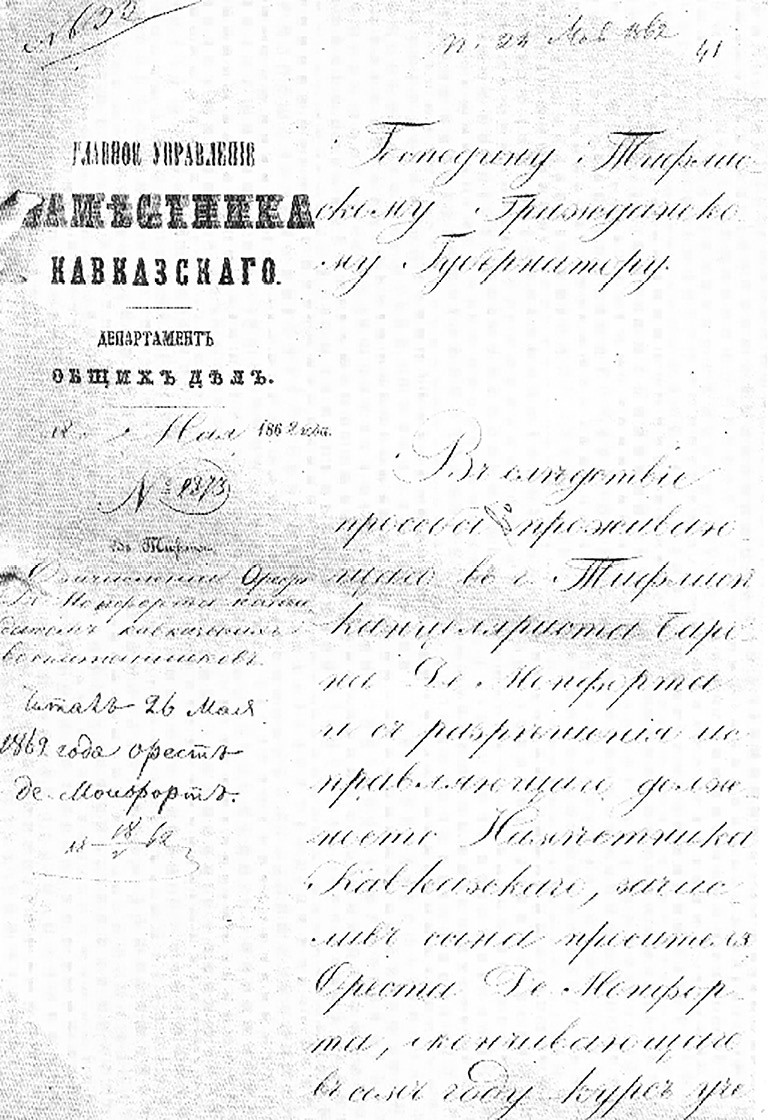 Характерно, что в Аттестате записано право Ореста на поступление в университет, причем утвержденное не только преподавательским составом гимназии, но и Тифлисским Гражданским Губернатором.