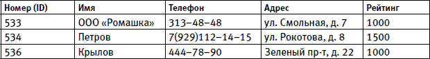 Каждое поле таблицы имеет строго определенный тип данных. Так, поля Номер (ID) и Рейтинг – числовые, а поля Имя, Телефон и Адрес – текстовые.