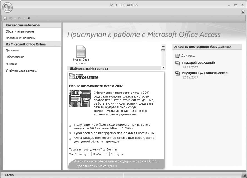 Рис. 1.2. Начальное окно Microsoft Access 2007