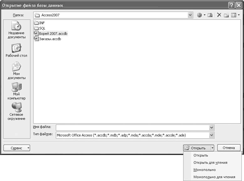 2. Щелкните кнопкой мыши на нужном файле базы данных и нажмите кнопку, находящуюся справа от кнопки Открыть (рис. 1.3). В меню открытия файла выберите пункт Открыть для чтения или пункт Монопольно для чтения.