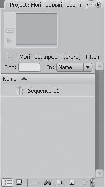 В верхней части окна Project (Проект) (рис. 1.8) расположено небольшое окно предварительного просмотра, в котором можно посмотреть клип или графический файл до помещения на экран Source (Источник) или последовательность Timeline (Окно монтажа). В этом диалоге также можно создавать корзины для сортировки различных исходных компонентов фильма. Например, одна корзина может содержать видеофрагменты, другая – звуковые файлы и т. д. Это может быть удобным, если фильм создается из большого количества фрагментов.