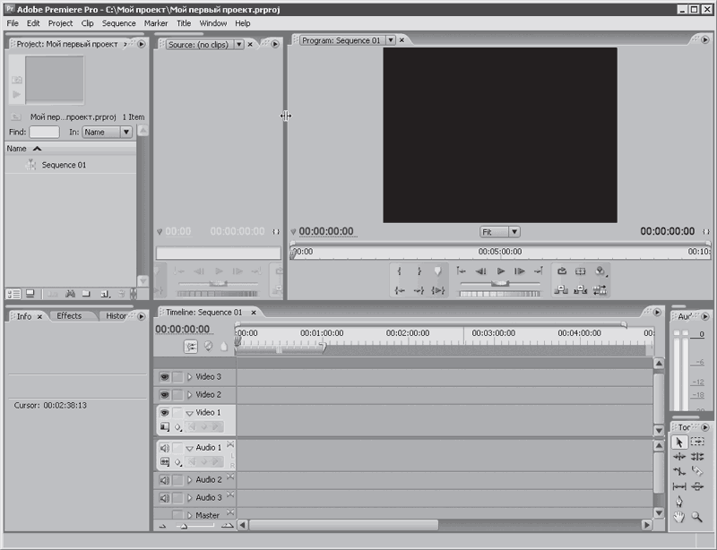 Попробуйте самостоятельно изменить размеры окон Project (Проект) и Timeline (Окно монтажа). Не бойтесь экспериментировать, чуть позже вы узнаете, как вернуть конфигурацию окон в первоначальный вид.