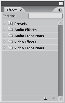 Вполне возможно, что вкладка Effects (Эффекты) разместилась не там, где вы хотели. Ничего страшного в этом нет. Перемещение окон и вкладок требует определенного навыка. Потренируйтесь самостоятельно, перемещая различные окна и вкладки.