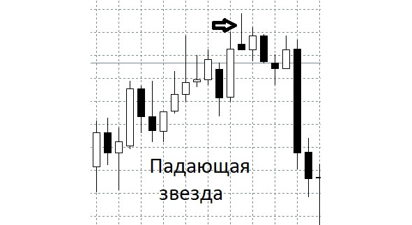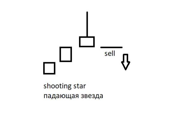 Падающая свезда – это тот же молот или повешенный, но в перевернутом положении. Маленькое тело и длинная верхняя тень. Нижняя тень пусть лучше отсутстует. Если находится наверху тренда вблизи важных уровней, то служит сигналом на продажу. Однако слабее молота и повешенного. Поэтому смотрите, чтобы цена следующей цены находилась ниже падающей звезды.