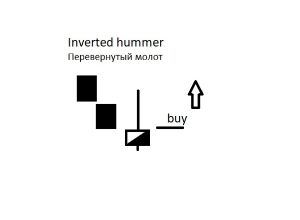 На нисходящем тренде появляется короткое тело с длинным верхним хвостом и отсутствием нижнего (либо он очень маленький). Цвет может быть как черным, так и белым (но белый перевернутый молот более бычий).