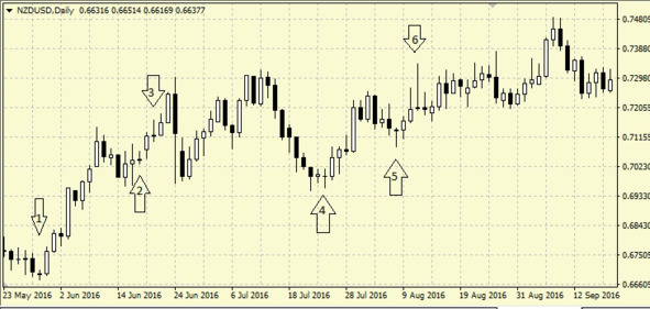 На графике мы видим 6 дожи. Первый идет в составе фигуры «звезда» (в главе «трехсвечные модели») и без проседания цена устремляется вверх. Второй дожи подтверждает окончание коррекции вниз. Третий дожи начинает предупреждать о скорой коррекции (осцилятор так же показывает дивергенцию). Четвертый и пятый дожи находятся на поддержке. Шестой дожи показал себя как отскок на от уровня на недельном графике. К тому же, даже и на дневном видно, что ближайший горбик или максимум находится на цене 0.7298, а значит, это возможный уровень сопротивления. При взятии на себя некоторого риска можно было и тут заработать, но уж не основываясь на этом шестом дожи. Из графика получается: 1, 2, 4 дожи оправдались и после них можно было бы покупать; 3 и 5 дожи так же оправдались и мы могли сделать деньги на продаже; 6 дожи не сработал.