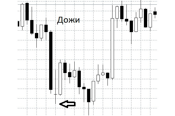 Дожи – это свеча с одинаковыми ценами открытия и закрытия. Обычный дожи похож на крестик. Свеча дожи демонстрирует нерешительность рынка и сигнализирует о возможном развороте рынка. Модель эта важна только на том рынке, где встречается редко. Не стоит обращать на нее внимание на пятиминутных графиках.