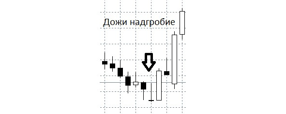 Дожи «Надгробие» имеет только верхнюю тень, которая должна быть длинной (сигнал сильнее), и не имеет нижней тени совсем. Цена открытия и закрытия одинакова внизу свечи.