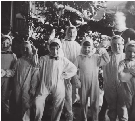 Дети-зайчики готовятся к праздникуВоспитатель детского сада готовила ребят к новогоднему выступлению перед родителями: это и выступление зайчиков, которые будут плясать вокруг елки, и исполнителей песенок, и танцы, которым научились детишки в преддверии нового, 1946, года. Все свои умения они должны показать перед собравшимися родителями в день празднования Нового года.