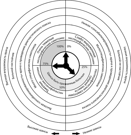 В правой части окружности указаны факторы, дающие низкие шансы интервьюируемому получить от врача заключение «болен» (условно менее 50 % для каждого фактора в отдельности), а в левой – высокие шансы. Кроме того, хорошо видно, что в клинической практике могут возникать очень неблагоприятные для больного сочетания, когда, например, застенчивый больной со слабовыраженными общими симптомами и малым числом специфических жалоб попадает на прием к врачу с низкой приверженностью к диагностическому поиску, невысокой эмпатией (умением сопереживать). В этом случае шансы больного получить врачебную помощь падают практически до нуля. Обычно указанные в левой и правой частях окружности факторы комбинируются самым причудливым образом, и в результате шансы каждого обратившегося находятся между 25 и 75 %.