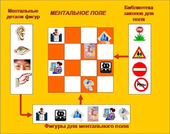 Процесс восприятия художественного литературного произведения очень наглядно, в рамках нашей теории информации, можно представить как игру в шахматы, но только в этом метафорическом примере шахматная доска расположена не на столе, а в мозгу читающего. То есть можно полагать, что восприятие романа читателем осуществляется в специально выделенной области мозга, которая устроена наподобие шахматного поля (рис. 2.4) – воображаемый квадрат, «расчерченный» на клетки. Назовем его ментальным полем. Рядом с этим ментальным полем расположены воображаемые фигурки, которые могут участвовать в ментальной «шахматной» игре. Описание автором литературных героев равносильно размещению фигур из набора на ментальном поле. При этом если соответствующей описанию фигуры нет в наборе, например, романтическая девушка не может вообразить на месте главного героя любимого человека, тогда образ собирается по инструкции (описанию) автора из деталей (нос, рот, глаза и т. п.). Ментальные детали фигурок находятся в ментальном банке воображаемых частей человеческого тела рядом с готовыми фигурками – всегда «под рукой». После размещения фигурок на ментальном поле, в каждую загружаются из ментальной «библиотеки законов» читателя правила ее поведения (как, например, у шахматного коня право ходить только буквой «Г») в соответствии с описанием автора. Не будем пока перегружать нашу метафору другими образами, чтобы в еще большей степени ее приблизить к процессу восприятия книги, так как проведенного нами построения достаточно для демонстрации соавторства читателя.