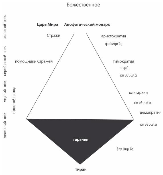 Тиран прямо противоположен Царю Мира, это его черный двойник. В тиране пародируется опрокинутая монархия, но только не Монархия Духа, а всевластие самых низменных свойств человека. Для Платона тиран – это самое проклятое существо. Его посмертная судьба, описанная в последней части «Государства» в рассказе Эра, воина, пережившего смерть и поведавшего о состояниях души после кончины тела, чудовищна. Душа тирана вообще никогда не способна покинуть ад и даже еще более глубокие уровни, расположенные ниже, чем ад, – области Тартара. Другие души отбывают в аду определенный срок. Душа тирана обречена быть там вечно.