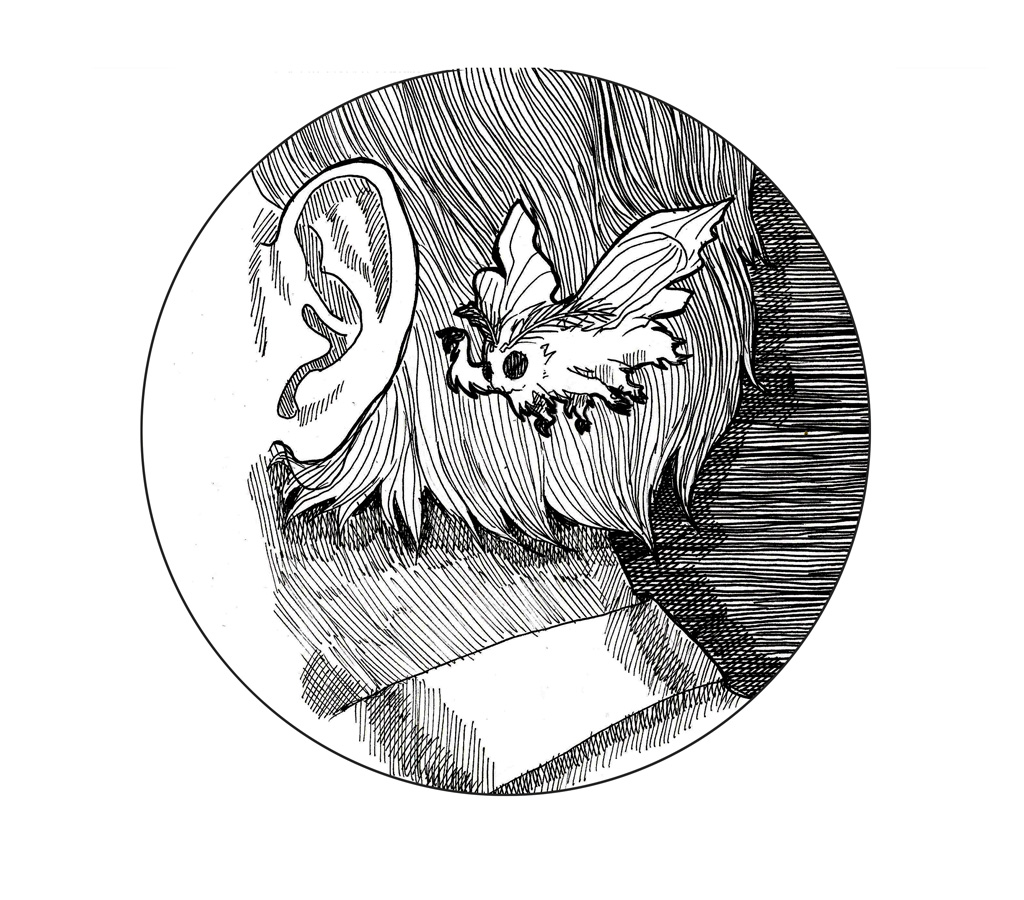 Прямо посреди груди, выступая над краем ночной рубашки, торчала голова огромного насекомого. Чёрная, блестящая фасеточными глазами, она вгрызалась желваками в грудь девушки.