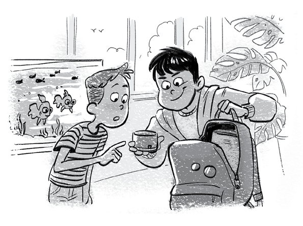 На первой перемене мы с Тимуром выходим из класса, и он меня тянет куда-то в дальний конец коридора, где аквариум.
