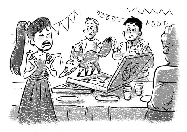 То есть не совсем так. Мы-то как раз в дверях притормозили. Мы же вежливые. А вот наш зверь, не будь дурак, первым делом на стол взобрался, прямо поверх тарелок со стаканами. Хвать самый жирный кусок пиццы – и слопал сразу. И оглядывается: чего бы ещё сожрать?
