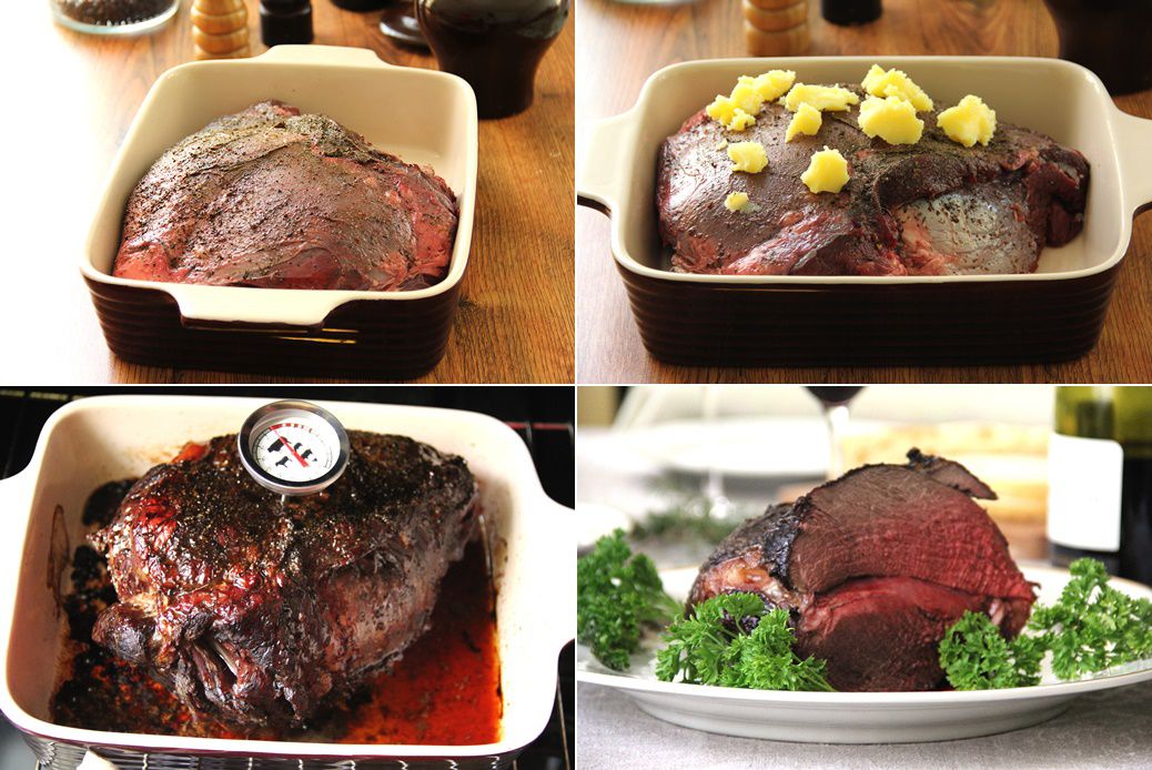 Соль, перец, чабер, можжевеловые ягоды, душистый перец и лавровый лист смешать с вином. Натереть мясо лося смесью специй с вином, завернуть в пищевую пленку и оставить в холодильнике на 12—24 ч. Выложить мясо в керамическую форму, обложить кусочками топленого масла и поставить в разогретую до 180°С духовку на 1 час, затем убавить температуру до 160°С и продолжить запекание ещё 1 час. Время от времени поливать мясо образовавшимся соком. Готовое мясо (идеальная температура внутри куска 65°С, если любите мясо «без крови», то время запекания увеличить на 30 минут) переложить на блюдо, украсить зеленью, нарезать на порции. Подавать с яблочным мармеладом, брусничным вареньем или грибным соусом.
