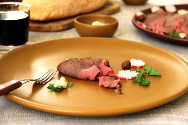 Печёную лосятину (см. Жаркое из лося по-охотничьи) нарезать тонкими ломтиками, красиво разложить на блюде, украсить листиками петрушки, тонко нарезанными ломтиками редиса, лесными орехами. Подавать с можжевеловым маслом(см. Можжевеловка), лесными орехами, печёными каштанами (см. Закуска из каштанов).