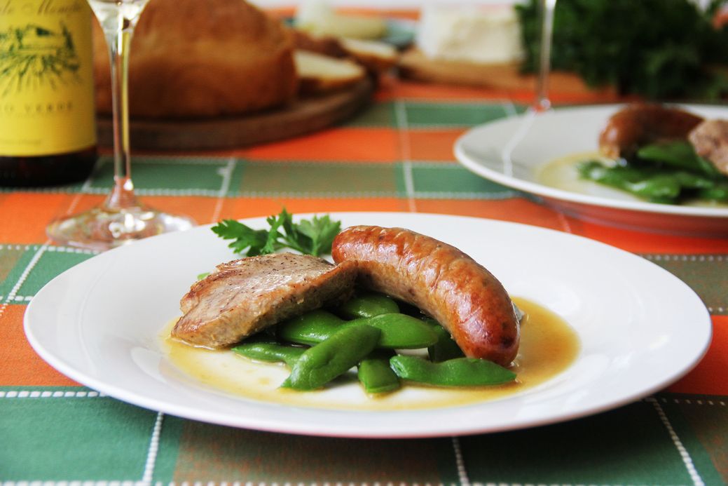 Индейку, колбасу и фасоль разложить по тарелкам, полить соусом от жарения. Подавать с тем же вином, которое использовали при приготовлении, украсить свежей петрушкой.