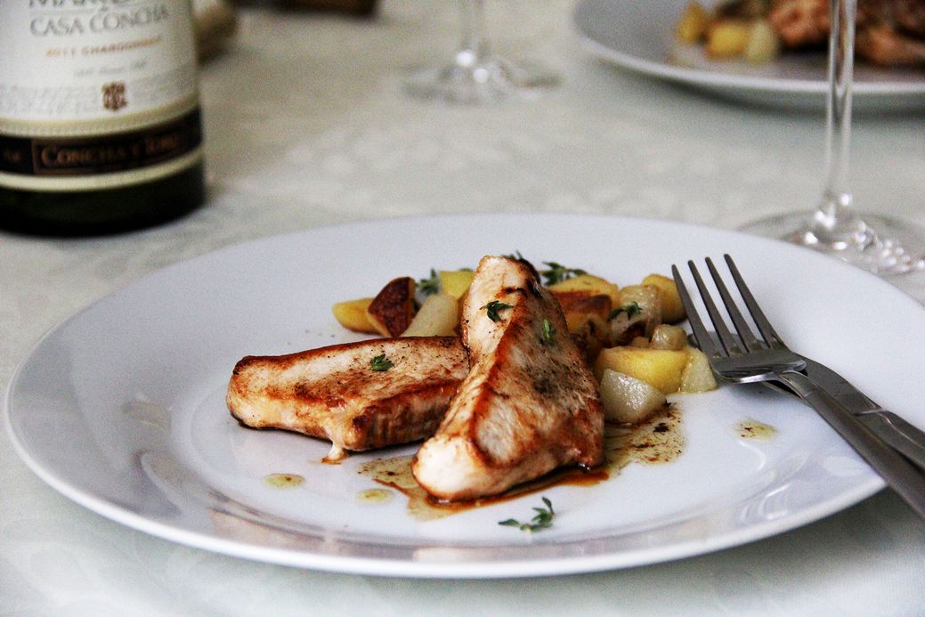 Нарезать грудку индейки поперек волокон на части по 70-80 г каждая, посолить и поперчить. Сливочное масло разогреть вместе с оливковым и по 2-3 минуты с каждой стороны обжарить эскалопы из индейки, выложить на тёплые тарелки. В сковороду, где жарилась индейка влить вино, довести до кипения и полить соусом мясо птицы.