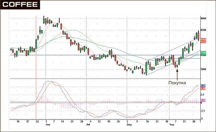 Шерри представила мне две недавние сделки: первую она закрыла тем утром, а вторая оставалась открытой. «Я купила кофе на откате 8 сентября, а сегодня вышла (23 сентября), потому что заметила медвежью модель поглощения на свечном графике».