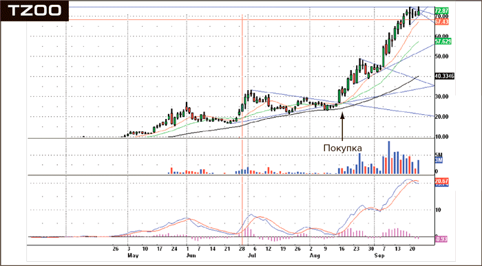 Она также показала все еще открытую позицию по акции TZOO, которая была в том году одной из самых горячих. «Я лучше многих вижу графические элементы – линии поддержки и сопротивления, линии тренда, конверты. Пока линии нисходящего тренда остаются прорванными, а линии восходящего тренда по-прежнему идут вверх, на рынке можно оставаться. К тому же эта акция не выходит из конверта, а значит, ее можно держать».