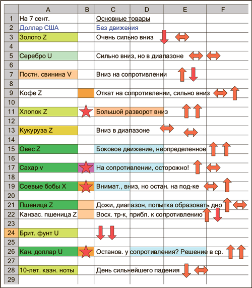 Шерри показала мне таблицу с результатами анализа товарных рынков, которую она каждый вечер посылает некоторым друзьям. Я обратил внимание на то, что за столбцом «Дневной тренд» идет столбец «Недельный тренд». В прошлом году она просматривала только дневные графики, а теперь анализирует и недельные. Интересно, что будет еще через год: не поменяет ли Шерри столбцы местами, сосредоточившись на более долгосрочных трендах?