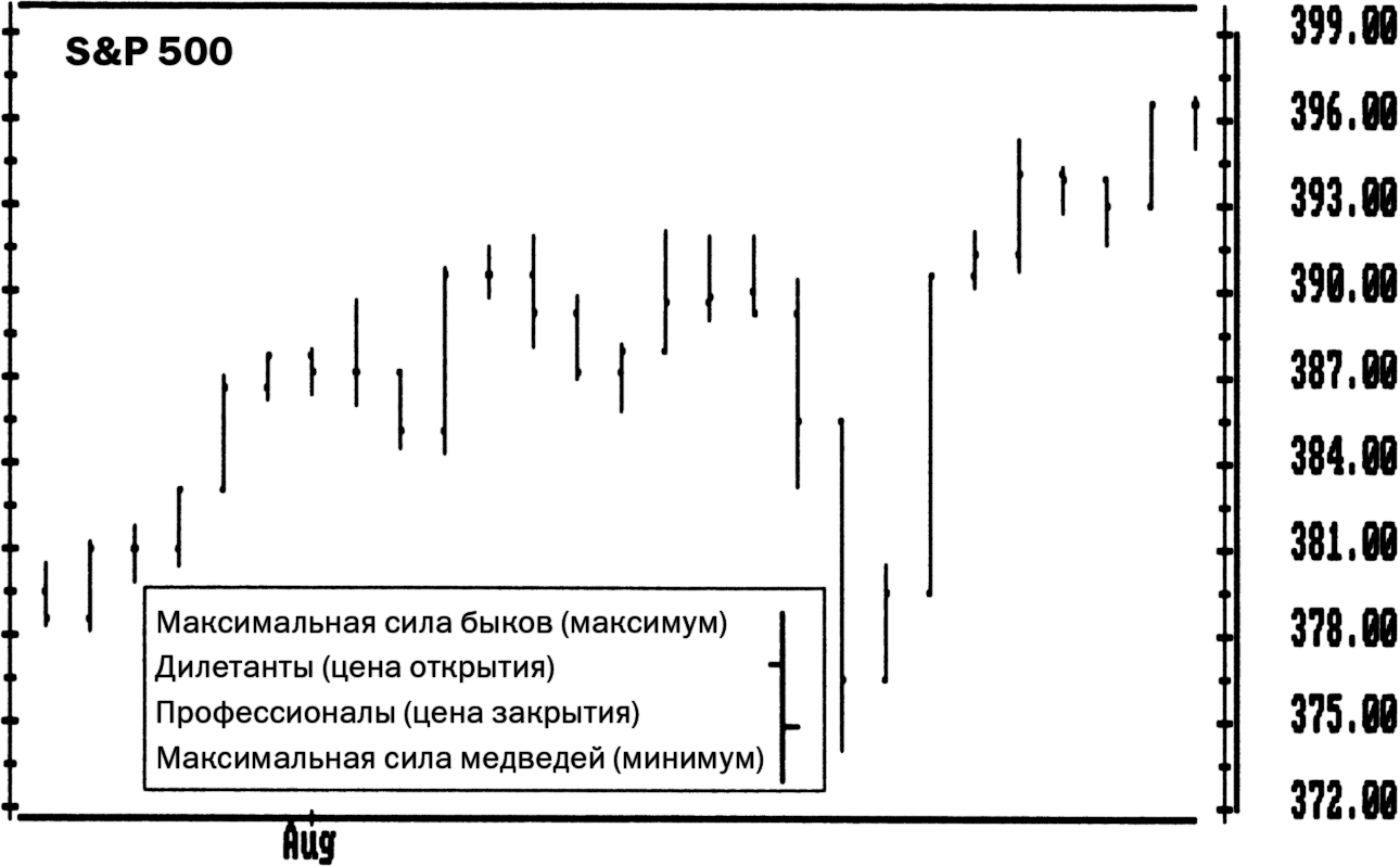 Цены открытия устанавливают в основном дилетанты: их скопившиеся за ночь приказы утром обрушиваются на биржу. Цены закрытия устанавливают преимущественно профессионалы, активно играющие в течение дня. Обратите внимание, как часто эти две точки располагаются на противоположных концах столбика.