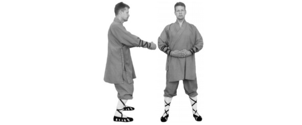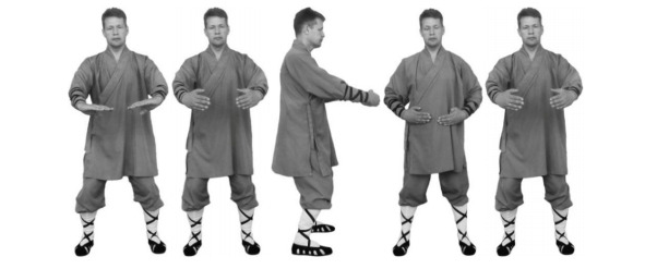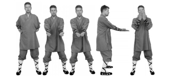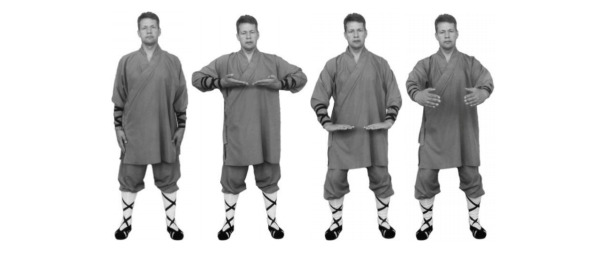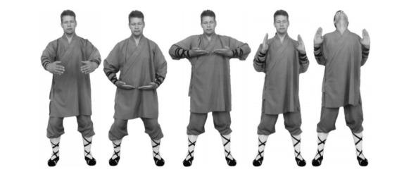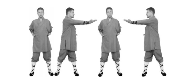 Встаньте ровно, стопы на ширине плеч, колени слегка согнуты, руки висят по бокам корпуса. Смотрите вперед, дыхание ровное через нос. Медленно вдыхая, поднимите ладони (центры направлены вверх) до уровня груди, колени на вдохе распрямите. Медленно поверните ладони центрами вниз и начните медленный выдох, опуская ладони вниз до нижнего «даньтянь». Повторите вдох и выдох 6 раз. После последнего опускания ладоней вниз вдохните и сделайте медленное круговое движение рук вперед на уровне живота. После этого сделайте выдох, нцентрируйтесь и постойте в этом положении на ровном дыхании около 1 мин.