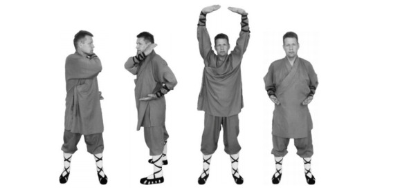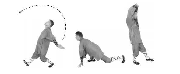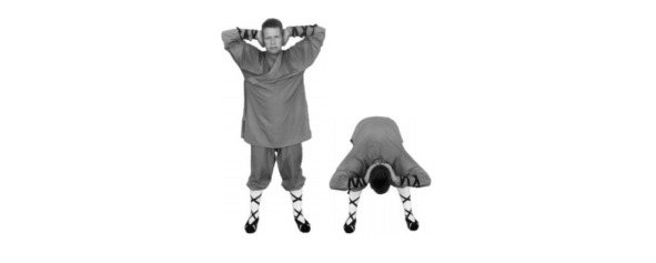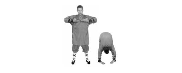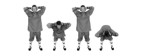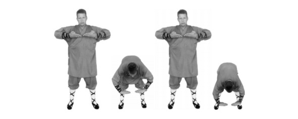 На выдохе поднимитесь, одновременно локти сведите перед собой и сделайте легкое надавливание тыльной стороной ладоней на боковую сторону шеи. Продолжая выдох, медленно опустите ладони вниз к нижней части живота. Плечи расслаблены, центры ладоней направлены вверх, смотрите вперед. Медленно вдыхая, поднимите ладони по центру вдоль корпуса вверх до положения над головой, смотрите на ладони. На выдохе опустите ладони через сторону вниз до положения возле «даньтянь». Медленно вдыхая, поднимите ладони вверх вдоль корпуса, центры ладоней направлены вверх, при этом одновременно оторвите пятки от земли. Предплечья доведите уровня груди, вдох закончился. Разверните ладони центрами вниз. Медленно выдыхая через рот, наклоните корпус вниз, пятки опустите на землю и сделайте медленное давящее движение ладонями вниз. Спина расслаблена, глаза широко открыты, смотреть на кончик носа. Постарайтесь наклониться до уровня колен, сконцентрируйте внимание на нижнем «даньтянь». Медленно вдыхая, поднимите ладони вверх вдоль корпуса, центры ладоней направлены вверх, при этом одновременно оторвите пятки от земли. Предплечья доведите уровня груди, вдох закончился. Разверните ладони центрами вниз. Медленно выдыхая через рот, наклоните корпус вниз, пятки опустите на землю и сделайте медленное давящее движение ладонями вниз. Спина расслаблена, глаза широко открыты, смотреть на кончик носа. Постарайтесь наклониться до уровня колен, сконцентрируйте внимание на нижнем «даньтянь». Медленно вдыхая, поднимите ладони вверх вдоль корпуса, центры ладоней направлены вверх, при этом одновременно оторвите пятки от земли. Предплечья доведите уровня груди, вдох закончился. Разверните ладони центрами вниз. Медленно выдыхая через рот, наклоните корпус вниз, пятки опустите на землю и сделайте медленное давящее движение ладонями вниз до касания земли. В конечном положении максимально расслабьте спину и голову немного поднимите, глаза широко открыты, смотрите на кончик носа. Сконцентрируйте свое внимание на нижнем «даньтянь» и оставайтесь в этом положении 30 секунд. Дыхание естественное. Желательно выполнять вышеописанные движения 6 раз. Делать в максимальном расслаблении.