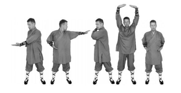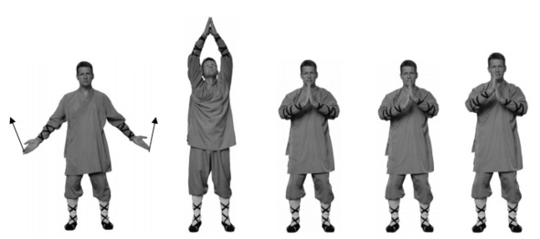 1) Ноги остаются на ширине плеч, колени слегка согнуты. Через нос медленно вдохнуть (брюшное дыхание через нос) и поднять ладони через боковые стороны вверх до положения над головой и соединить их, при этом слегка подняться на носочках. Медленно выдыхая через нос, опустить ладони вниз до положения на уровне груди, при этом слегка согнуть колени. Оставаясь в этом положении, почувствуйте жар в точке «лао – гун» в центре ладони (точка с меридиана перикарда, положительно влияет на работу сердечно – сосудистой системы). При медленном вдохе одна ладонь делает растирающее движение вверх, а другая – вниз. При выдохе направление их движение меняется на обратное. Сделать 18 раз. Имеются противопоказания. Необходима консультация специалиста.